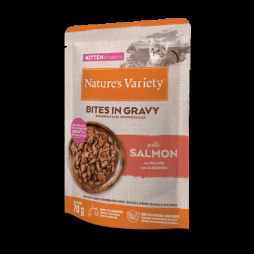 Mime o seu gatinho em crescimento com uma receita deliciosa e nutritiva: Nature's Variety Kitten Pedacinhos de Salmão em Molho. Uma opção ideal para gatinhos dos 2 aos 12 meses, feita com ingredientes naturais, proteínas de qualidade e cozinhada a vapor para uma refeição saborosa e equilibrada.