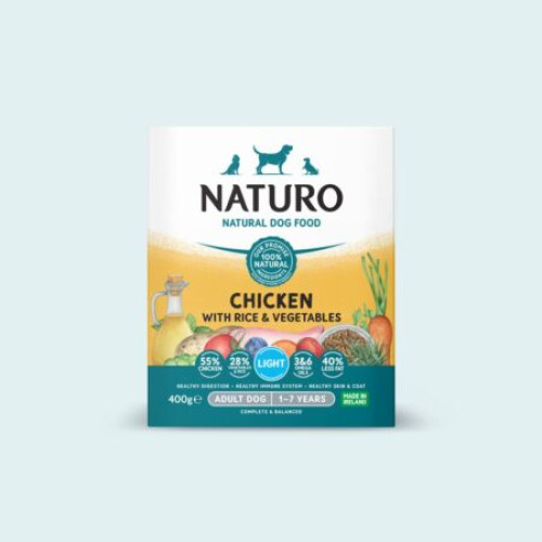 Naturo Light é composta por 50% de carne de frango, arroz integral e verduras como as cenouras e as ervilhas. Também contém batata, tomate seco, alga desidratada e manjericão, além de óleo de salmão para melhorar a pele e a pelagem. É um alimento húmido completamente natural, rico em carne e sem subprodutos, corantes artificiais ou conservantes. Uma opção ideal para complementar a ração dos cães com excesso de peso sem colocar o seu estado físico em risco. A receita é muito saborosa e oferece um extra de nutrientes, vitaminas e minerais à dieta.