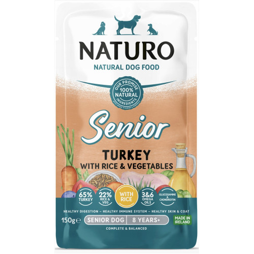 A comida húmida Naturo Senior é uma opção fantástica para cada dia ou como um delicioso e saudável prémio sempre que desejar. É uma receita 100% natural e tem 60% de carne acompanhada de arroz integral e vegetais como as cenouras e as ervilhas, e de batatas, tomate seco e manjericão. Uma combinação única de ingredientes que lhe oferecem um grande sabor. Também contém óleo de salmão, glucosamina e condroitina, para assim melhorar o estado da pele e do pelo e cuidar da saúde das articulações. Além dos seus ingredientes naturais, não utiliza subprodutos, conservantes nem corantes artificiais.
