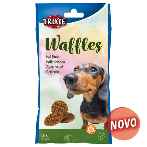 Os snacks Trixie Waffles são um petisco que irá deliciar o seu cão. Possuem carne de frango e não contêm glúten, o que ajuda a reduzir as sensibilidades alimentares do animal.