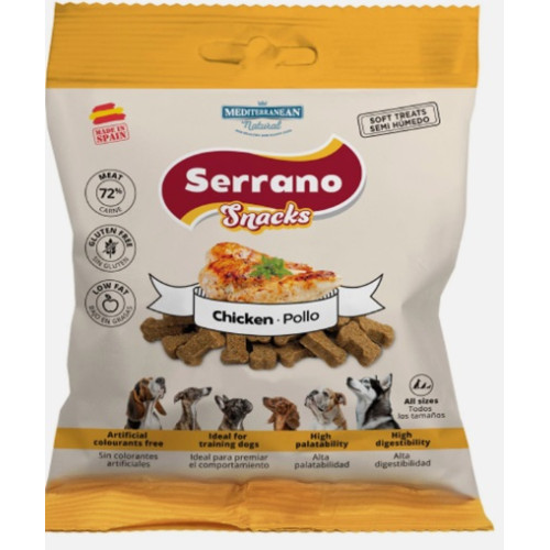 As Serrano Snacks de MEDITERRANEAN NATURAL, delicadamente cortadas em pequenas quantidades em forma de osso, garantem a segurança do animal de estimação, mantêm sua pureza e todos os nutrientes, refletem a dieta natural e contêm 70% de carne fresca