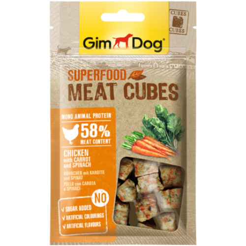 GimDog Superfood Meat Cubes combina galinha de alta qualidade com super alimentos selecionados.É usada uma única fonte de proteina nestes snacks deliciosos. Cenoura é uma fonte natural de carroteno, vitaminas e antioxidantes. Espinafres tem naturalmente elevados niveis de vitaminas, minerais e proteina.