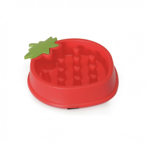 Tigela de plástico em formato de morango com sistema anti-engolfo.