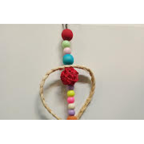 Brinquedo para aves feito em rafia, madeira de nogueira e pinheiro com sino.