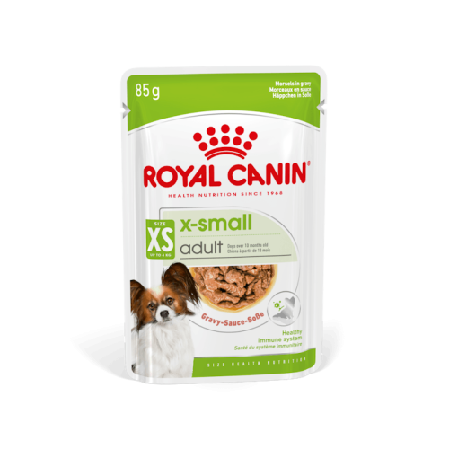 O ROYAL CANIN® X-Small Adult pedaços com molho é um alimento húmido nutricionalmente completo e equilibrado especialmente formulado para satisfazer as necessidades específicas do seu cão de raça muito pequena e apoiá-lo ao longo da sua vida adulta. Este alimento destina-se aos cães de raças muito pequenas que pesam até 4 kg e que têm mais de 10 meses.