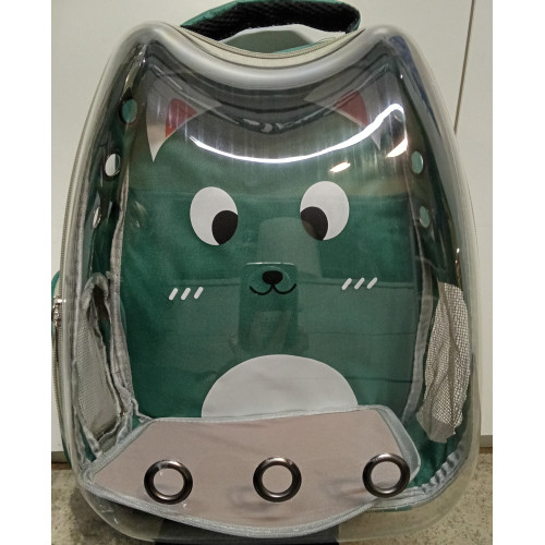 Mochila verde e cinza para transporte de animais, com visor transparente e aberturas respiraveis.