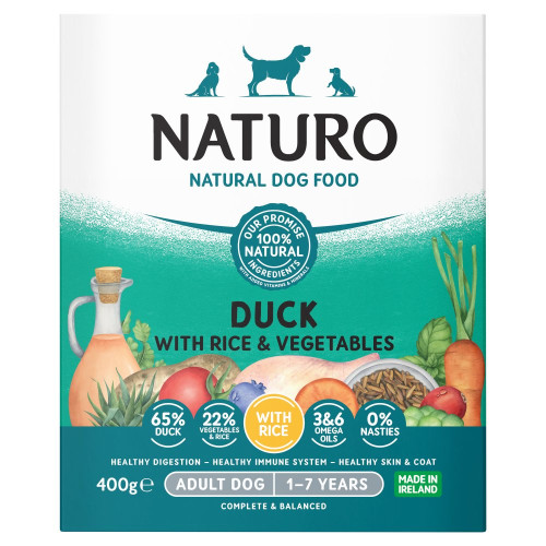Naturo pato com arroz para cães é uma comida húmida natural elaborada com grandes percentagens de carne. Não tem nenhum subproduto, conservante nem corante, apenas ingredientes saudáveis que cuidam da saúde do seu animal de estimação. Uma opção ideal para alimentar o seu cão cada dia com um alimento de primeira qualidade e muito nutritivo.
