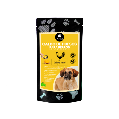O caldo de ossos de frango, da Pet'Bel, é um caldo orgânico feito a partir de frangos criados ao ar livre, recomendado para cães de todas as idades, para facilitar a digestão, hidratar e enriquecer a alimentação regular.